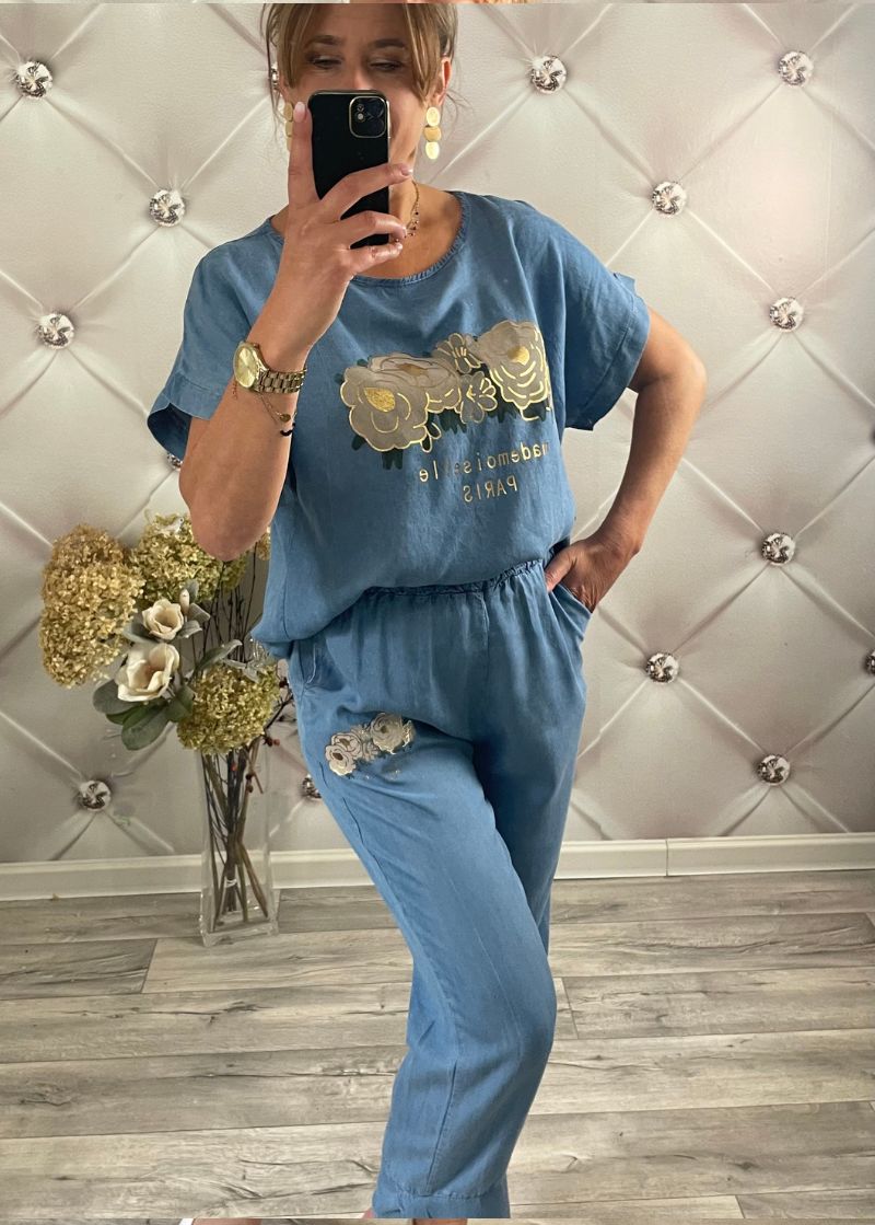 KOMPLET JEANSOWY ZE ZŁOTĄ RÓŻĄ