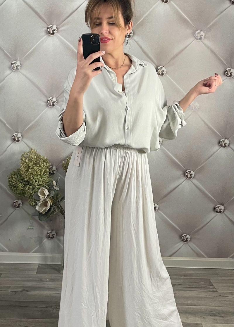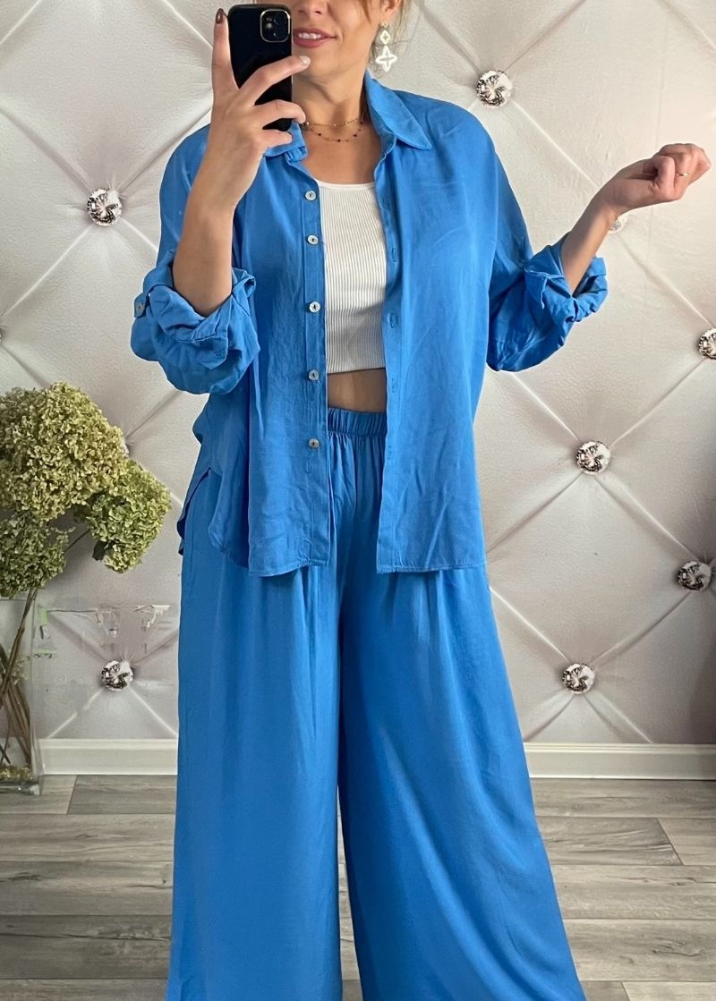 STYLOWY ZESTAW Z WISKOZY- KOMFORT I ELEGANCJA NA CODZIEŃ. LUŹNA OVERSIZOWA KOSZULA Z KOŁNIERZYKIEM ORAZ SPODNIE TYPU SZWEDY NA GUMIE. NIE POSIADAJĄ KIESZENI, TYŁ SPODNI GŁADKI. MATERIAŁ LEJĄCY, PRZEWIEWNY, OPŁYWAJĄCY CIAŁO, NIE UCIĄGA SIĘ. RĘKAW REGULOWANY.